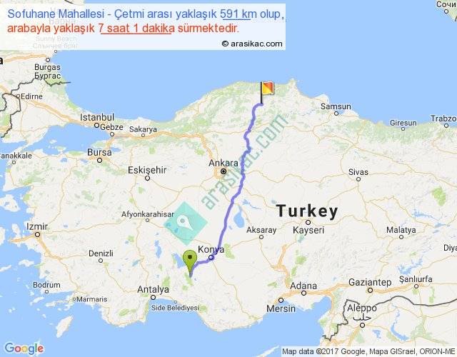 Sofuhane Mahallesi - Çetmi arası yaklaşık olarak 90 km/h ile yukarıda belirtilen sürede olup, iki yerin kuş uçuşu uzaklığı (mesafesi) 489'dir. Eğer belirtilen yerler arasında uçak seferi var ise bu süre uçakla 45 dakika'ya kadar düşebilir. Yolculuk otobüsle 9 saat 7 dakika sürmektedir.