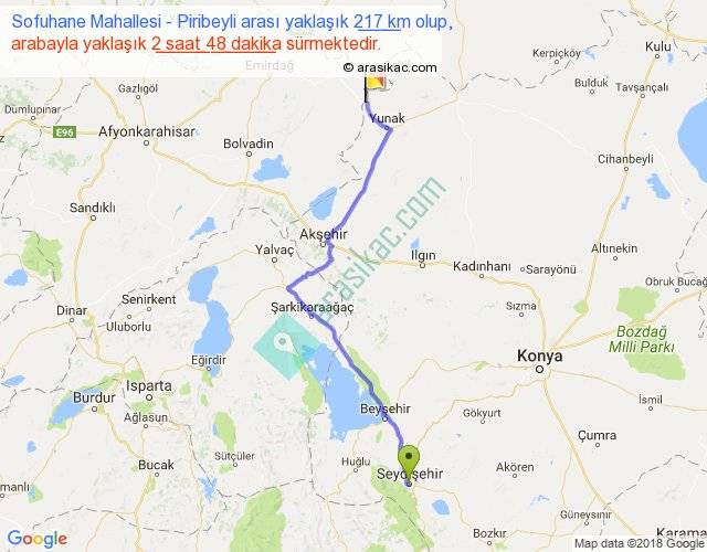 Sofuhane Mahallesi - Piribeyli arası yaklaşık olarak 90 km/h ile yukarıda belirtilen sürede olup, iki yerin kuş uçuşu uzaklığı (mesafesi) 166'dir. Yolculuk otobüsle 3 saat 38 dakika sürmektedir.