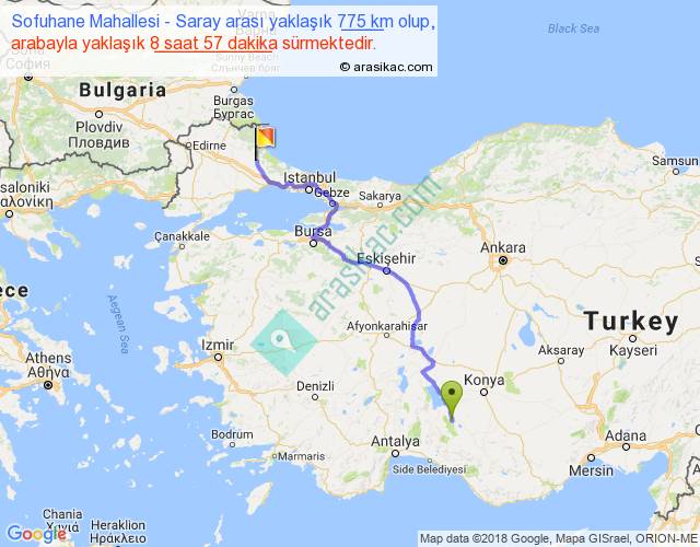 Sofuhane Mahallesi - Saray arası yaklaşık olarak 90 km/h ile yukarıda belirtilen sürede olup, iki yerin kuş uçuşu uzaklığı (mesafesi) 556'dir. Eğer belirtilen yerler arasında uçak seferi var ise bu süre uçakla 51 dakika'ya kadar düşebilir. Yolculuk otobüsle 11 saat 38 dakika sürmektedir.