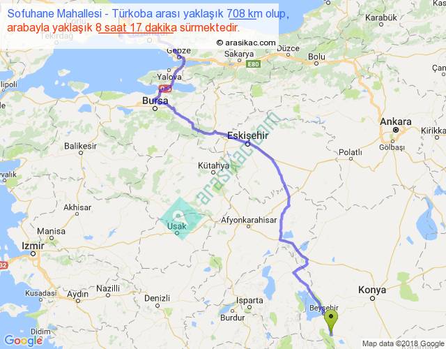 Sofuhane Mahallesi - Türkoba arası yaklaşık olarak 90 km/h ile yukarıda belirtilen sürede olup, iki yerin kuş uçuşu uzaklığı (mesafesi) 492'dir. Eğer belirtilen yerler arasında uçak seferi var ise bu süre uçakla 45 dakika'ya kadar düşebilir. Yolculuk otobüsle 10 saat 46 dakika sürmektedir.