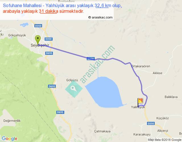 Sofuhane Mahallesi - Yalıhüyük arası yaklaşık olarak 90 km/h ile yukarıda belirtilen sürede olup, iki yerin kuş uçuşu uzaklığı (mesafesi) 25'dir. Yolculuk otobüsle 40 dakika sürmektedir.