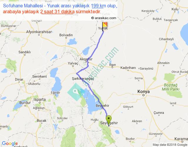 Sofuhane Mahallesi - Yunak arası yaklaşık olarak 90 km/h ile yukarıda belirtilen sürede olup, iki yerin kuş uçuşu uzaklığı (mesafesi) 154'dir. Yolculuk otobüsle 3 saat 16 dakika sürmektedir.