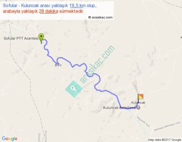 Sofular - Kuluncak arası yaklaşık olarak 90 km/h ile yukarıda belirtilen sürede olup, iki yerin kuş uçuşu uzaklığı (mesafesi) 12'dir. Yolculuk otobüsle 36 dakika sürmektedir.