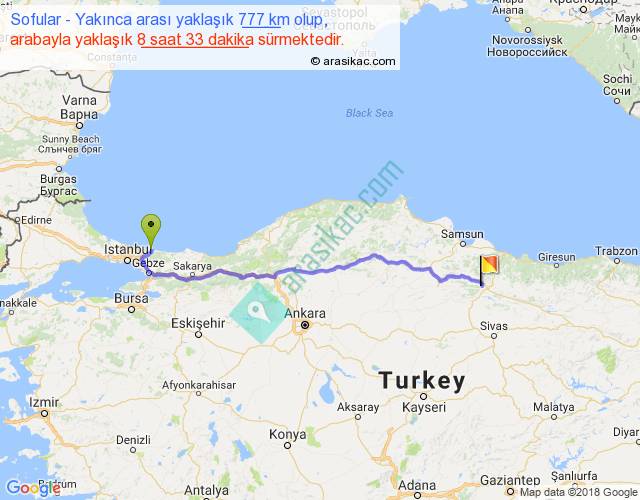 Sofular - Yakınca arası yaklaşık olarak 90 km/h ile yukarıda belirtilen sürede olup, iki yerin kuş uçuşu uzaklığı (mesafesi) 610'dir. Eğer belirtilen yerler arasında uçak seferi var ise bu süre uçakla 56 dakika'ya kadar düşebilir. Yolculuk otobüsle 11 saat 6 dakika sürmektedir.