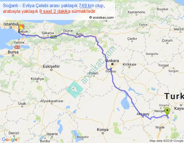 Soğanlı - Evliya Çelebi arası yaklaşık olarak 90 km/h ile yukarıda belirtilen sürede olup, iki yerin kuş uçuşu uzaklığı (mesafesi) 556'dir. Eğer belirtilen yerler arasında uçak seferi var ise bu süre uçakla 51 dakika'ya kadar düşebilir. Yolculuk otobüsle 10 saat 26 dakika sürmektedir.