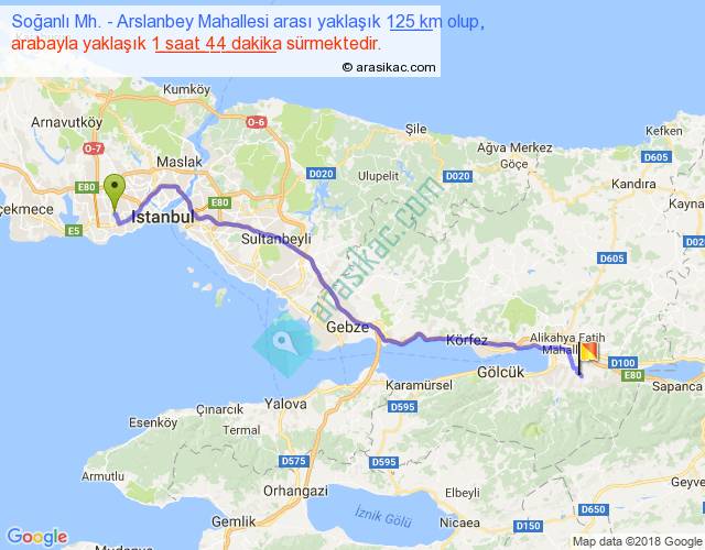 Soğanlı Mh. - Arslanbey Mahallesi arası yaklaşık olarak 90 km/h ile yukarıda belirtilen sürede olup, iki yerin kuş uçuşu uzaklığı (mesafesi) 103'dir. Yolculuk otobüsle 2 saat 15 dakika sürmektedir.