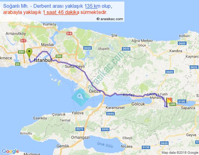 Soğanlı Mh. - Derbent arası yaklaşık olarak 90 km/h ile yukarıda belirtilen sürede olup, iki yerin kuş uçuşu uzaklığı (mesafesi) 108'dir. Yolculuk otobüsle 2 saat 17 dakika sürmektedir.