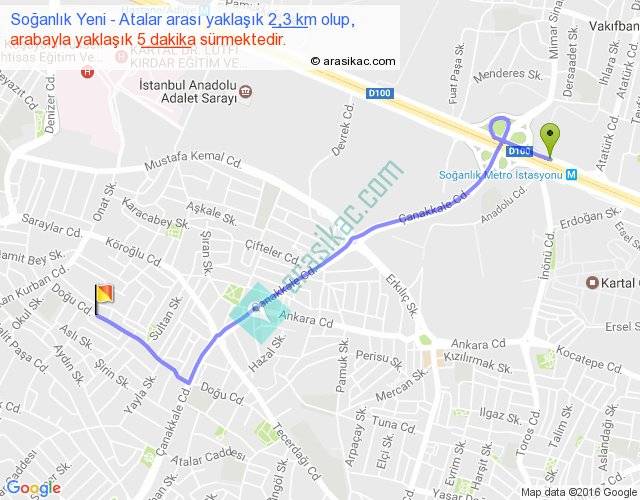 Soğanlık Yeni - Atalar arası yaklaşık olarak 90 km/h ile yukarıda belirtilen sürede olup, iki yerin kuş uçuşu uzaklığı (mesafesi) 2'dir. Yolculuk otobüsle 6 dakika sürmektedir.