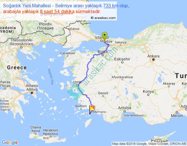 Soğanlık Yeni Mahallesi - Selimiye arası yaklaşık olarak 90 km/h ile yukarıda belirtilen sürede olup, iki yerin kuş uçuşu uzaklığı (mesafesi) 474'dir. Eğer belirtilen yerler arasında uçak seferi var ise bu süre uçakla 43 dakika'ya kadar düşebilir. Yolculuk otobüsle 11 saat 34 dakika sürmektedir.