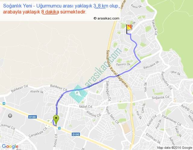 Soğanlık Yeni - Uğurmumcu arası yaklaşık olarak 90 km/h ile yukarıda belirtilen sürede olup, iki yerin kuş uçuşu uzaklığı (mesafesi) 3'dir. Yolculuk otobüsle 10 dakika sürmektedir.