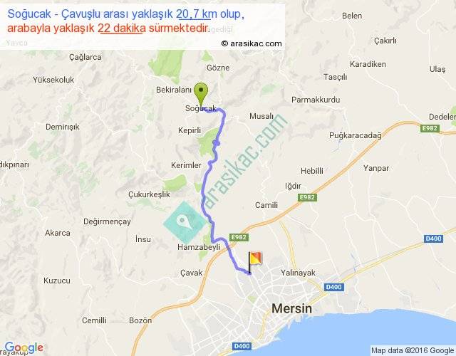 Soğucak - Çavuşlu arası yaklaşık olarak 90 km/h ile yukarıda belirtilen sürede olup, iki yerin kuş uçuşu uzaklığı (mesafesi) 15'dir. Yolculuk otobüsle 28 dakika sürmektedir.