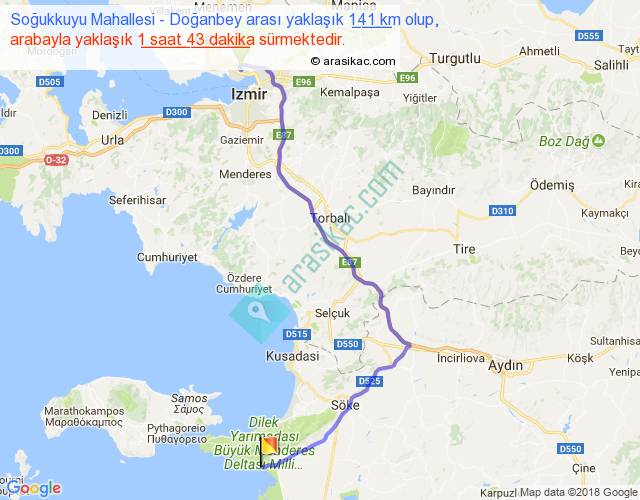 Soğukkuyu Mahallesi - Doğanbey arası yaklaşık olarak 90 km/h ile yukarıda belirtilen sürede olup, iki yerin kuş uçuşu uzaklığı (mesafesi) 95'dir. Yolculuk otobüsle 2 saat 13 dakika sürmektedir.