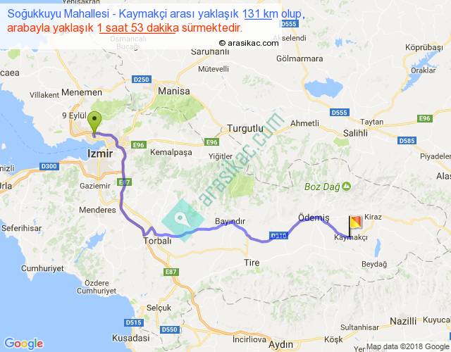 Soğukkuyu Mahallesi - Kaymakçi arası yaklaşık olarak 90 km/h ile yukarıda belirtilen sürede olup, iki yerin kuş uçuşu uzaklığı (mesafesi) 93'dir. Yolculuk otobüsle 2 saat 26 dakika sürmektedir.