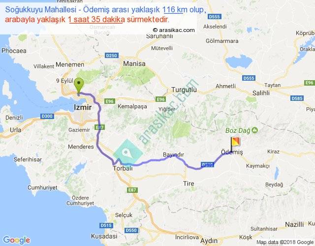 Soğukkuyu Mahallesi - Ödemiş arası yaklaşık olarak 90 km/h ile yukarıda belirtilen sürede olup, iki yerin kuş uçuşu uzaklığı (mesafesi) 79'dir. Yolculuk otobüsle 2 saat 3 dakika sürmektedir.