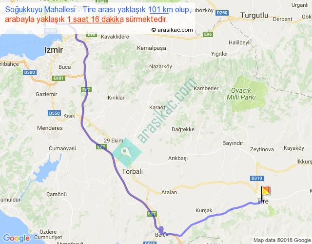 Soğukkuyu Mahallesi - Tire arası yaklaşık olarak 90 km/h ile yukarıda belirtilen sürede olup, iki yerin kuş uçuşu uzaklığı (mesafesi) 68'dir. Yolculuk otobüsle 1 saat 38 dakika sürmektedir.
