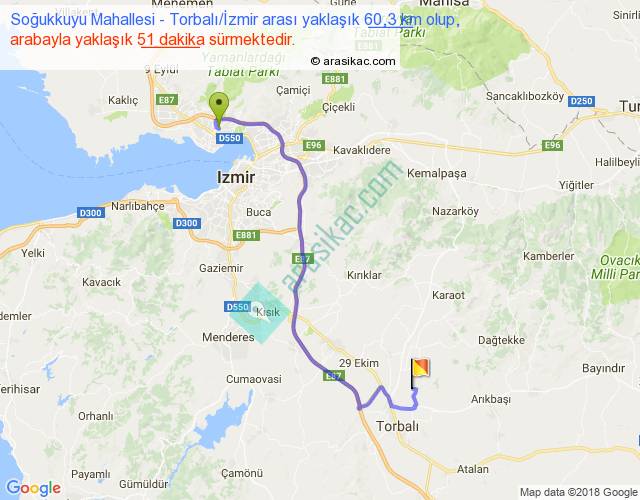 Soğukkuyu Mahallesi - Torbalı İzmir arası yaklaşık olarak 90 km/h ile yukarıda belirtilen sürede olup, iki yerin kuş uçuşu uzaklığı (mesafesi) 39'dir. Yolculuk otobüsle 1 saat 6 dakika sürmektedir.
