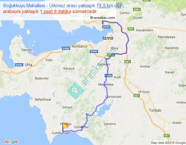 Soğukkuyu Mahallesi - Ürkmez arası yaklaşık olarak 90 km/h ile yukarıda belirtilen sürede olup, iki yerin kuş uçuşu uzaklığı (mesafesi) 47'dir. Yolculuk otobüsle 1 saat 28 dakika sürmektedir.
