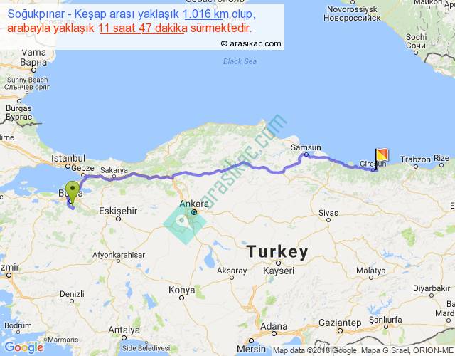 Soğukpınar - Keşap arası yaklaşık olarak 90 km/h ile yukarıda belirtilen sürede olup, iki yerin kuş uçuşu uzaklığı (mesafesi) 795'dir. Eğer belirtilen yerler arasında uçak seferi var ise bu süre uçakla 1 saat 13 dakika'ya kadar düşebilir. Yolculuk otobüsle 15 saat 19 dakika sürmektedir.