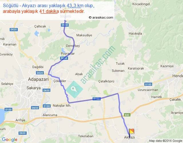 Söğütlü - Akyazı arası yaklaşık olarak 90 km/h ile yukarıda belirtilen sürede olup, iki yerin kuş uçuşu uzaklığı (mesafesi) 28'dir. Yolculuk otobüsle 53 dakika sürmektedir.