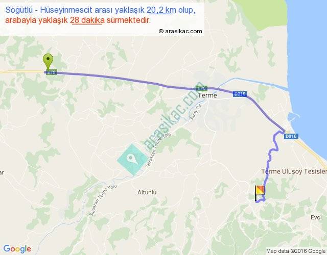 Söğütlü - Hüseyinmescit arası yaklaşık olarak 90 km/h ile yukarıda belirtilen sürede olup, iki yerin kuş uçuşu uzaklığı (mesafesi) 14'dir. Yolculuk otobüsle 36 dakika sürmektedir.