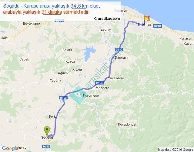 Söğütlü - Karasu arası yaklaşık olarak 90 km/h ile yukarıda belirtilen sürede olup, iki yerin kuş uçuşu uzaklığı (mesafesi) 28'dir. Yolculuk otobüsle 40 dakika sürmektedir.