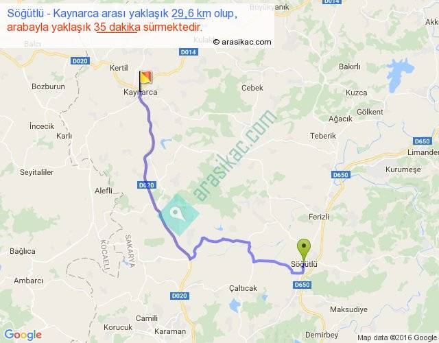 Söğütlü - Kaynarca arası yaklaşık olarak 90 km/h ile yukarıda belirtilen sürede olup, iki yerin kuş uçuşu uzaklığı (mesafesi) 20'dir. Yolculuk otobüsle 45 dakika sürmektedir.