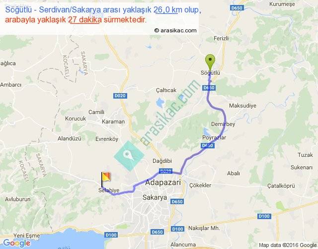 Söğütlü - Serdivan Sakarya arası yaklaşık olarak 90 km/h ile yukarıda belirtilen sürede olup, iki yerin kuş uçuşu uzaklığı (mesafesi) 18'dir. Yolculuk otobüsle 35 dakika sürmektedir.
