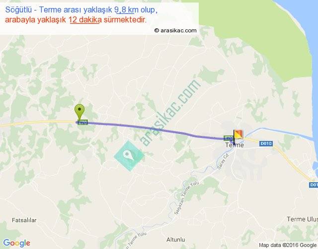 Söğütlü - Terme arası yaklaşık olarak 90 km/h ile yukarıda belirtilen sürede olup, iki yerin kuş uçuşu uzaklığı (mesafesi) 9'dir. Yolculuk otobüsle 15 dakika sürmektedir.