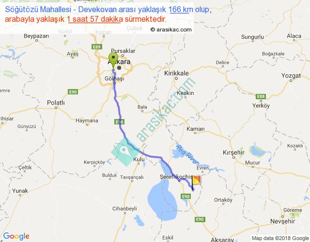 Söğütözü Mahallesi - Devekovan arası yaklaşık olarak 90 km/h ile yukarıda belirtilen sürede olup, iki yerin kuş uçuşu uzaklığı (mesafesi) 140'dir. Yolculuk otobüsle 2 saat 32 dakika sürmektedir.