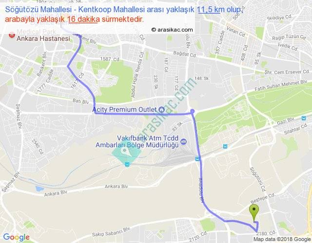 Söğütözü Mahallesi - Kentkoop Mahallesi arası yaklaşık olarak 90 km/h ile yukarıda belirtilen sürede olup, iki yerin kuş uçuşu uzaklığı (mesafesi) 8'dir. Yolculuk otobüsle 20 dakika sürmektedir.