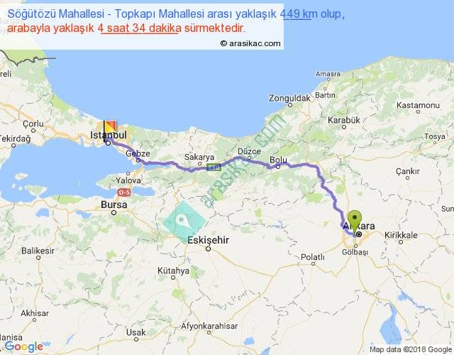 Söğütözü Mahallesi - Topkapı Mahallesi arası yaklaşık olarak 90 km/h ile yukarıda belirtilen sürede olup, iki yerin kuş uçuşu uzaklığı (mesafesi) 347'dir. Eğer belirtilen yerler arasında uçak seferi var ise bu süre uçakla 32 dakika'ya kadar düşebilir. Yolculuk otobüsle 5 saat 56 dakika sürmektedir.