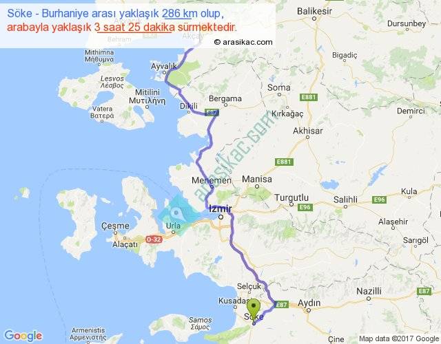 Söke - Burhaniye arası yaklaşık olarak 90 km/h ile yukarıda belirtilen sürede olup, iki yerin kuş uçuşu uzaklığı (mesafesi) 197'dir. Yolculuk otobüsle 4 saat 26 dakika sürmektedir.