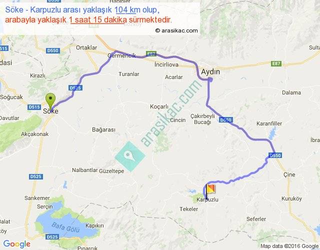 Söke - Karpuzlu arası yaklaşık olarak 90 km/h ile yukarıda belirtilen sürede olup, iki yerin kuş uçuşu uzaklığı (mesafesi) 43'dir. Yolculuk otobüsle 1 saat 37 dakika sürmektedir.