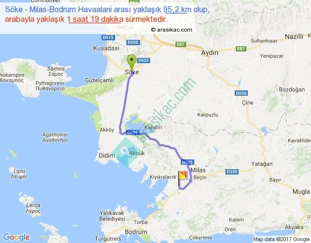 Söke - Milas-Bodrum Havaalani arası yaklaşık olarak 90 km/h ile yukarıda belirtilen sürede olup, iki yerin kuş uçuşu uzaklığı (mesafesi) 61'dir. Yolculuk otobüsle 1 saat 42 dakika sürmektedir.