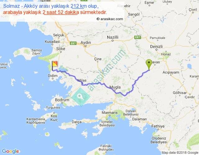 Solmaz - Akköy arası yaklaşık olarak 90 km/h ile yukarıda belirtilen sürede olup, iki yerin kuş uçuşu uzaklığı (mesafesi) 149'dir. Yolculuk otobüsle 3 saat 43 dakika sürmektedir.