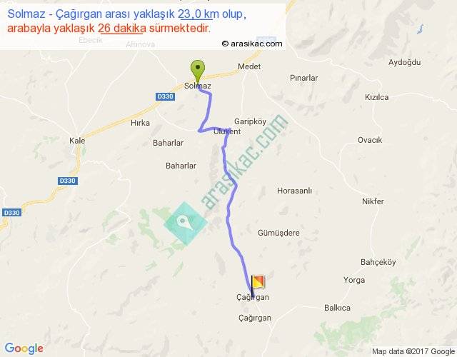 Solmaz - Çağırgan arası yaklaşık olarak 90 km/h ile yukarıda belirtilen sürede olup, iki yerin kuş uçuşu uzaklığı (mesafesi) 18'dir. Yolculuk otobüsle 33 dakika sürmektedir.