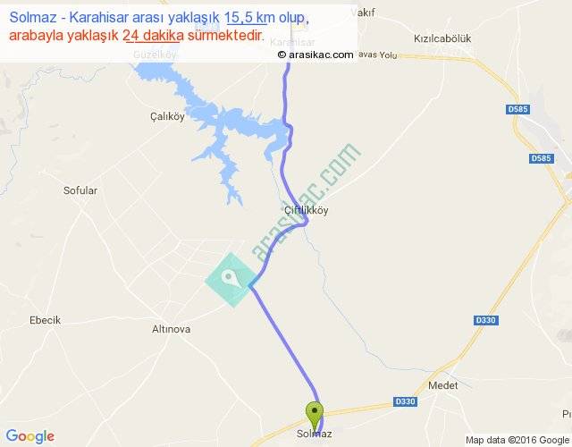 Solmaz - Karahisar arası yaklaşık olarak 90 km/h ile yukarıda belirtilen sürede olup, iki yerin kuş uçuşu uzaklığı (mesafesi) 13'dir. Yolculuk otobüsle 31 dakika sürmektedir.