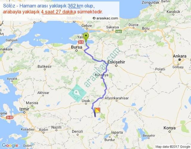 Sölöz - Hamam arası yaklaşık olarak 90 km/h ile yukarıda belirtilen sürede olup, iki yerin kuş uçuşu uzaklığı (mesafesi) 233'dir. Yolculuk otobüsle 5 saat 47 dakika sürmektedir.