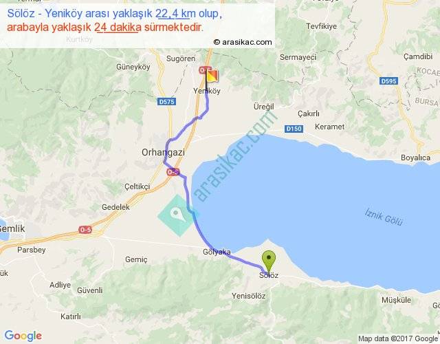 Sölöz - Yeniköy arası yaklaşık olarak 90 km/h ile yukarıda belirtilen sürede olup, iki yerin kuş uçuşu uzaklığı (mesafesi) 16'dir. Yolculuk otobüsle 31 dakika sürmektedir.