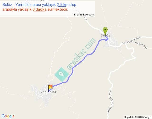 Sölöz - Yenisölöz arası yaklaşık olarak 90 km/h ile yukarıda belirtilen sürede olup, iki yerin kuş uçuşu uzaklığı (mesafesi) 2'dir. Yolculuk otobüsle 7 dakika sürmektedir.