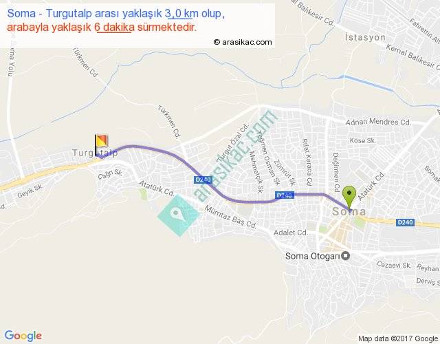 Soma - Turgutalp arası yaklaşık olarak 90 km/h ile yukarıda belirtilen sürede olup, iki yerin kuş uçuşu uzaklığı (mesafesi) 3'dir. Yolculuk otobüsle 7 dakika sürmektedir.