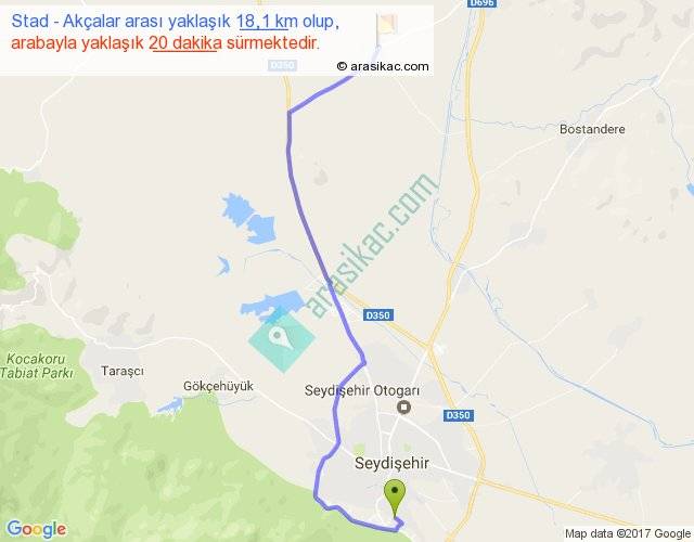 Stad - Akçalar arası yaklaşık olarak 90 km/h ile yukarıda belirtilen sürede olup, iki yerin kuş uçuşu uzaklığı (mesafesi) 13'dir. Yolculuk otobüsle 26 dakika sürmektedir.