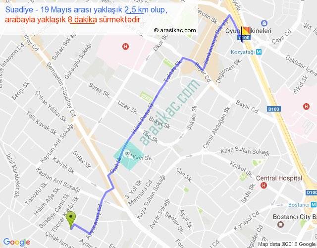 Suadiye - 19 Mayıs arası yaklaşık olarak 90 km/h ile yukarıda belirtilen sürede olup, iki yerin kuş uçuşu uzaklığı (mesafesi) 2'dir. Yolculuk otobüsle 10 dakika sürmektedir.