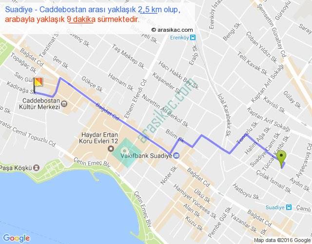 Suadiye - Caddebostan arası yaklaşık olarak 90 km/h ile yukarıda belirtilen sürede olup, iki yerin kuş uçuşu uzaklığı (mesafesi) 2'dir. Yolculuk otobüsle 11 dakika sürmektedir.