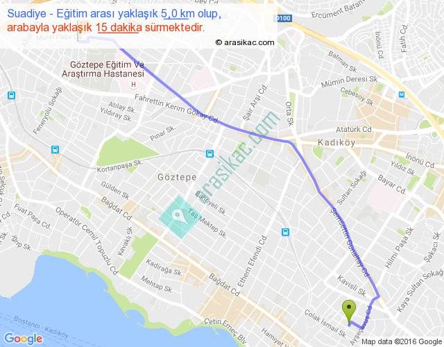 Suadiye - Eğitim arası yaklaşık olarak 90 km/h ile yukarıda belirtilen sürede olup, iki yerin kuş uçuşu uzaklığı (mesafesi) 4'dir. Yolculuk otobüsle 19 dakika sürmektedir.
