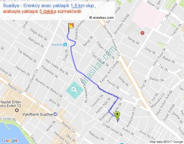 Suadiye - Erenköy arası yaklaşık olarak 90 km/h ile yukarıda belirtilen sürede olup, iki yerin kuş uçuşu uzaklığı (mesafesi) 1'dir. Yolculuk otobüsle 6 dakika sürmektedir.