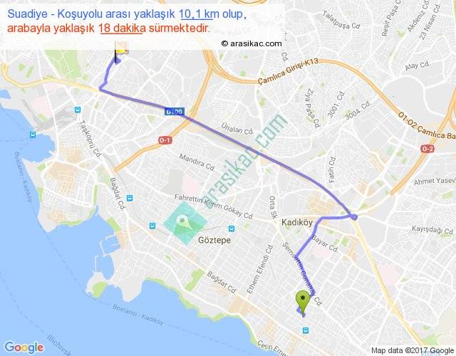Eğer Suadiye Koşuyolu arası ne kadar yakar (benzin/mazot) diyorsanız, kilometrede 3 ₺ yakan bir aracınız var ise 30, km'de 4 ₺ yakan bir aracınız var ise 40, km'de 5 ₺ yakan bir aracınız var ise 50 ile bu yolculuğu tamamlayabilirsiniz.