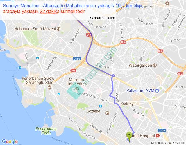 Suadiye Mahallesi - Altunizade Mahallesi arası yaklaşık olarak 90 km/h ile yukarıda belirtilen sürede olup, iki yerin kuş uçuşu uzaklığı (mesafesi) 7'dir. Yolculuk otobüsle 28 dakika sürmektedir.