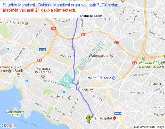 Suadiye Mahallesi - Bulgurlu Mahallesi arası yaklaşık olarak 90 km/h ile yukarıda belirtilen sürede olup, iki yerin kuş uçuşu uzaklığı (mesafesi) 6'dir. Yolculuk otobüsle 27 dakika sürmektedir.
