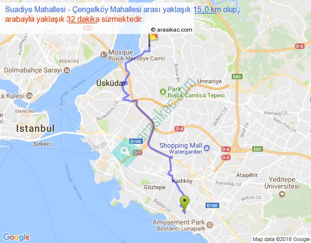 Eğer Suadiye Mahallesi Çengelköy Mahallesi arası ne kadar yakar (benzin/mazot) diyorsanız, kilometrede 3 ₺ yakan bir aracınız var ise 45, km'de 4 ₺ yakan bir aracınız var ise 60, km'de 5 ₺ yakan bir aracınız var ise 75 ile bu yolculuğu tamamlayabilirsiniz.